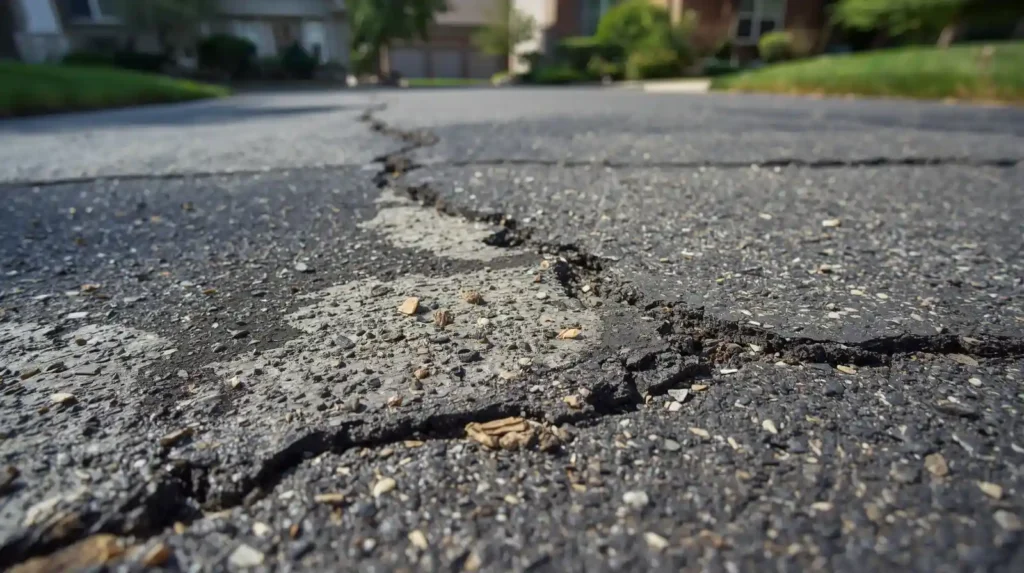 Each sign points to a different issue. Fading means the sun is wearing down the top layer. Cracks mean water is trying to get inside. Low spots suggest the foundation is settling. Brittleness means the surface is drying out and losing strength.