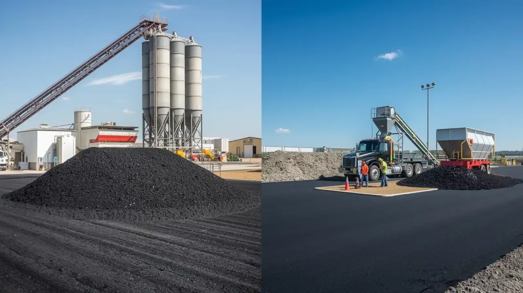 The biggest difference is the level of control. Plants make large batches with exact measurements. On site mixes are used for simple repairs where full plant production is not needed. For most driveways and roads, plant made asphalt is the better choice because it is more consistent and long lasting.